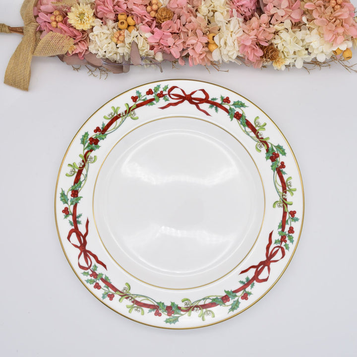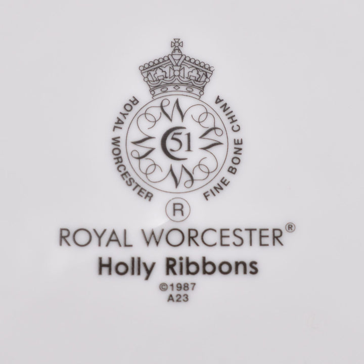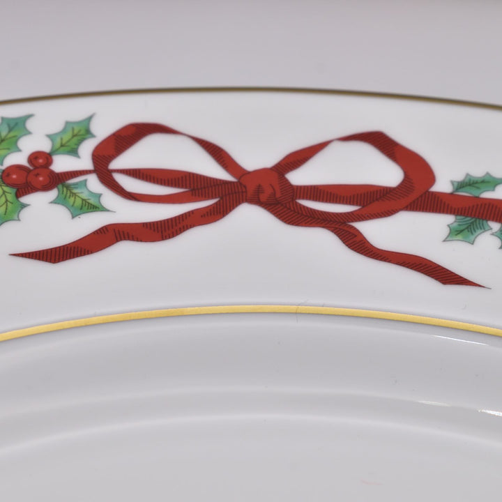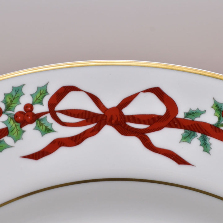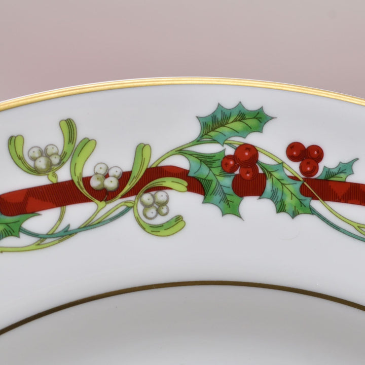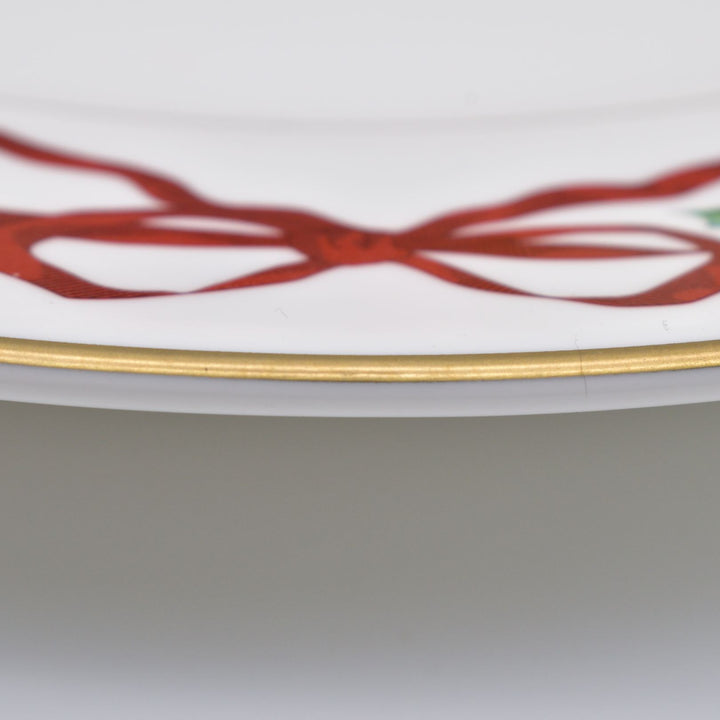 白磁の上に広がる繊細なリボン模様とヒイラギの緑。