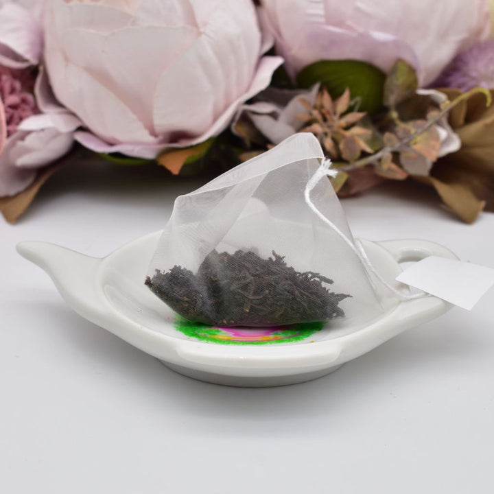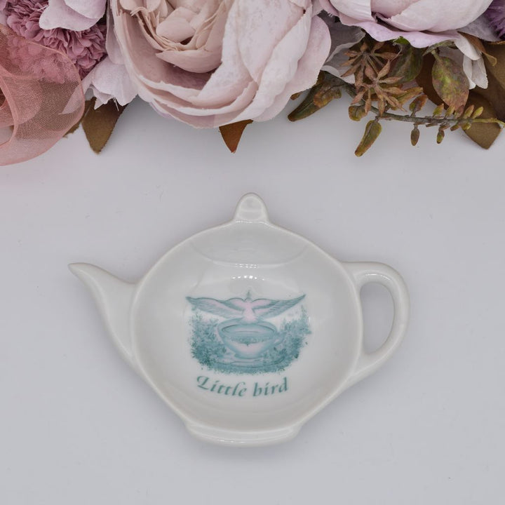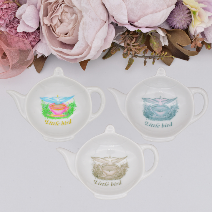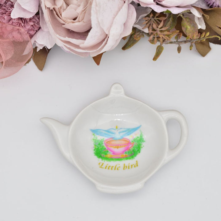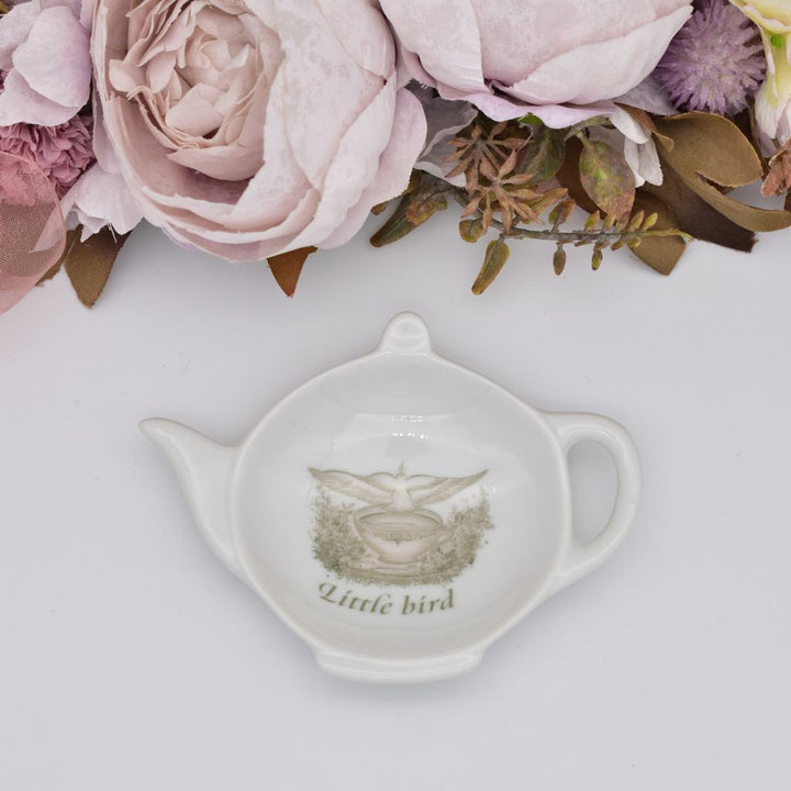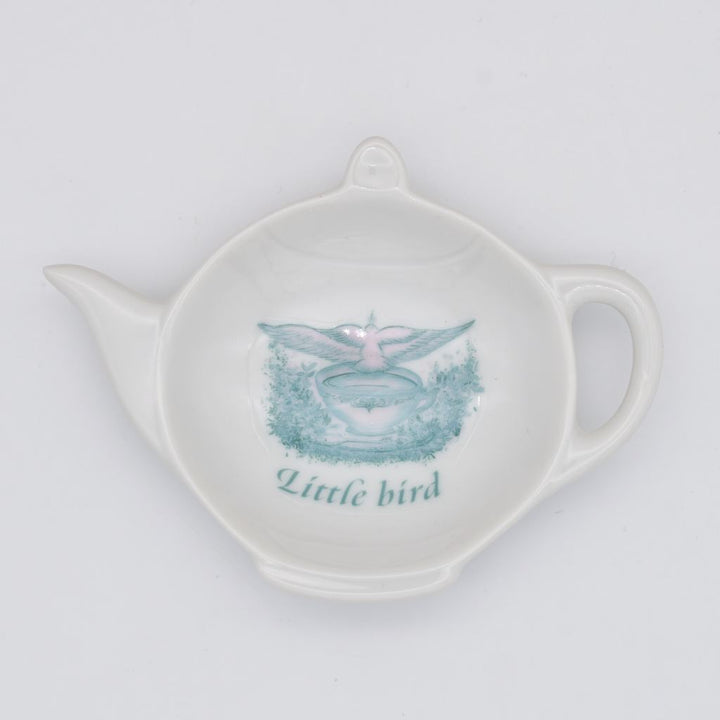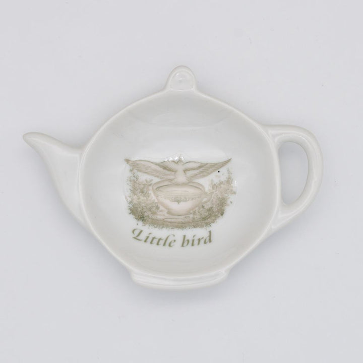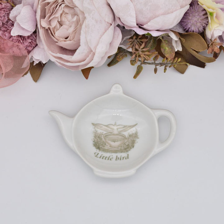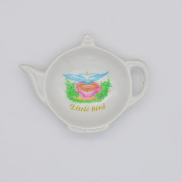 ティーポットの形をした、やさしい雰囲気のセラミック製ティーバッグトレイ。